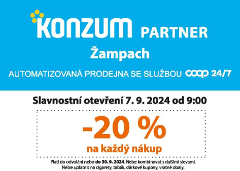 On Saturday, September 7, 2024, the grand opening of the unattended municipal store KONZUM in Žampach took place. This is the 8th autonomous shop of the KONZUM Ústí nad Orlicí business cooperative. KONZUM continues the popular model of “municipal franchise” with this store, where both the municipality and the wholesale partner participate in the project.